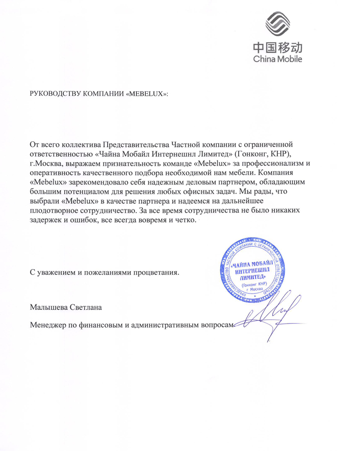 От всего коллектива Представительства Частной компании с ограниченной ответственностью "Чайна Мобайл Интернешнл Лимитед" (Гонконг, КНР) в г. Москва, выражаем признательность команде "Mebelux" за профессионализм и оперативность качественного подбора необходимой нам мебели. Компания "Mebelux" зарекомендовала себя надежным деловым партнером, обладающим большим потенциалом для решения любых офисных задач. Мы рады, что выбрали "Mebelux" в качестве партнера и надеемся на дальнейшее плодотворное сотрудничество. За время сотрудничества не было никаких задержек и ошибок, все всегда вовремя и четко.
