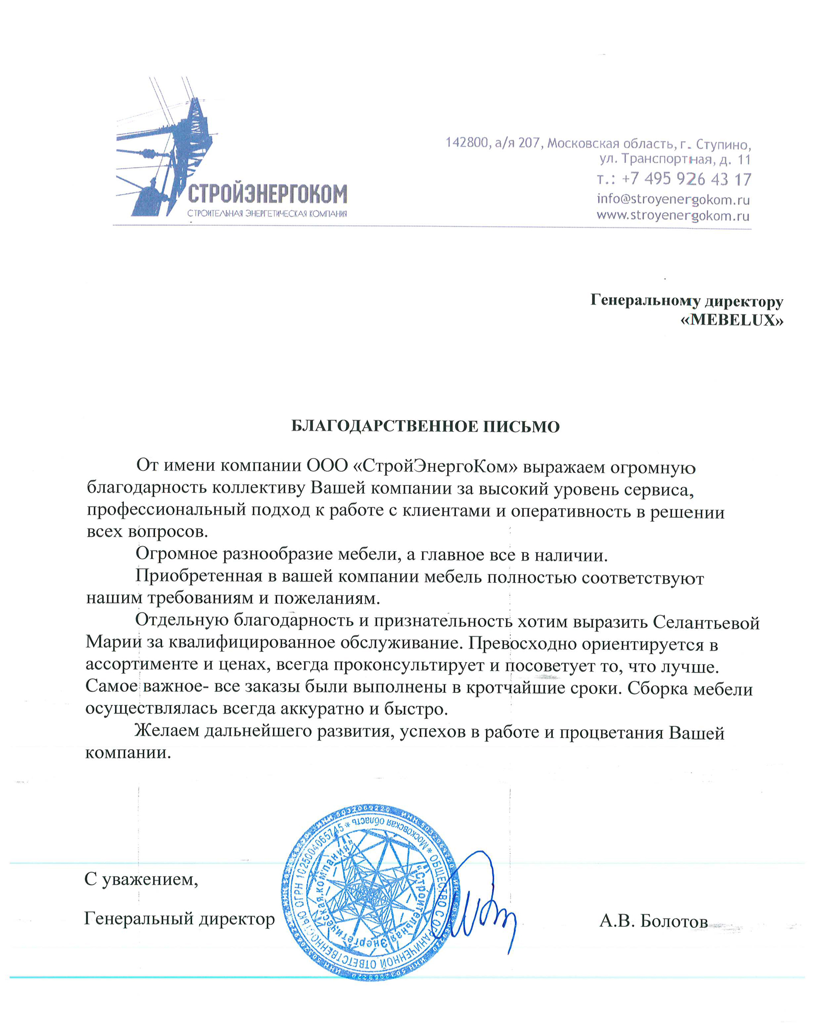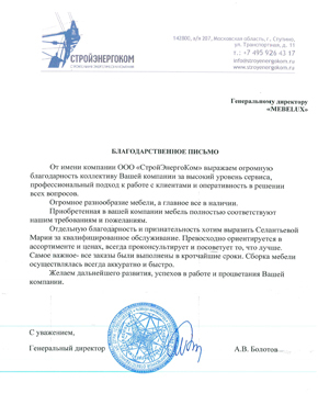 Отзыв о компании Mebelux от ООО "Стройэнергоком"